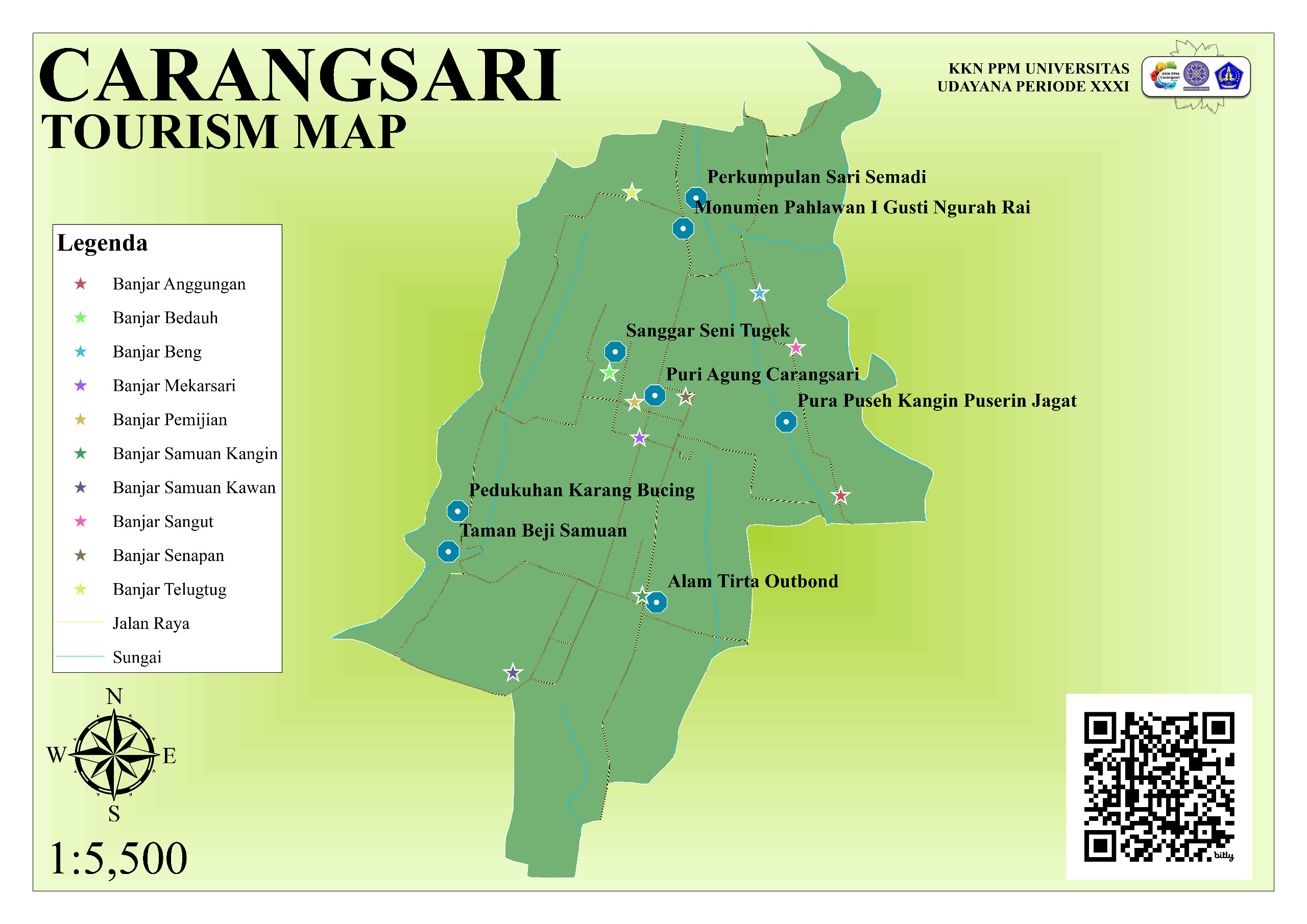 Desa ini menawarkan beragam atraksi yang memadukan unsur budaya, sejarah, dan alam. Puri Agung Carangsari, tempat kelahiran I Gusti Ngurah Rai, menyimpan peninggalan arsitektur Bali kuno, sementara Monumen I Gusti Ngurah Rai menghadirkan kisah heroik perjuangan bangsa. Potensi budaya lainnya terlihat dari keberadaan Topeng Tugek Carangsari yang telah dikenal hingga ke Los Angeles, Amerika Serikat. Pengunjung dapat menikmati pertunjukan tari atau bahkan belajar langsung di sanggar Topeng Tugek Carangsari, serta mengunjungi sanggar seni untuk mempelajari tarian dan musik Bali.